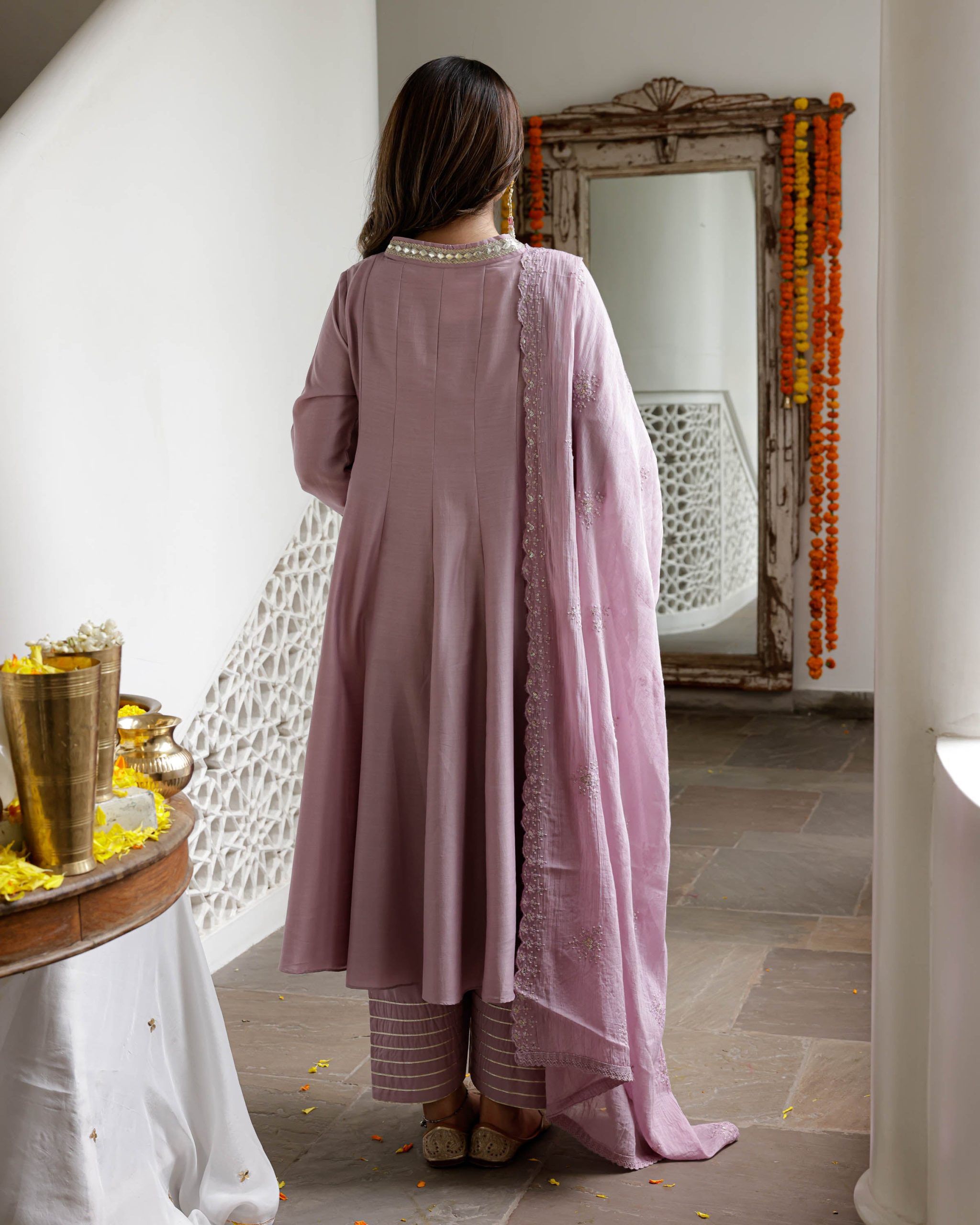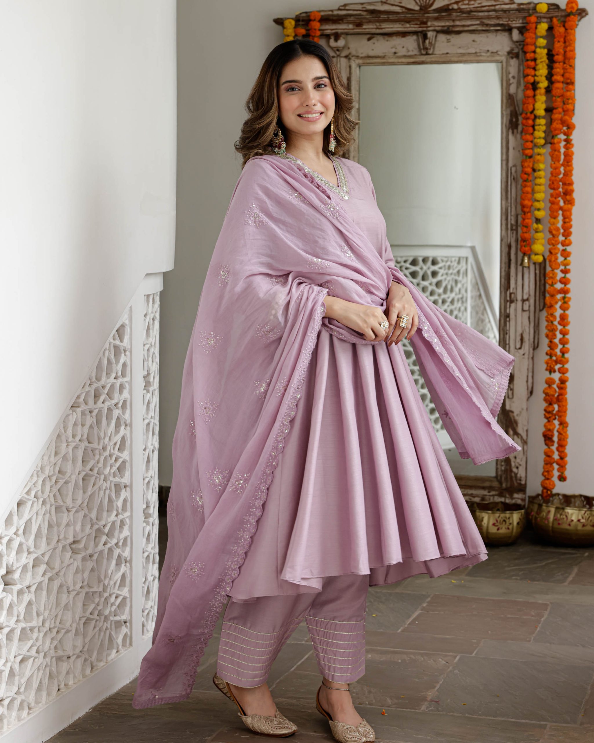 A pastel lavender Anarkali suit with delicate threadwork, paired with slim pants and a scallop-edged dupatta — elegance designed for festive occasions.