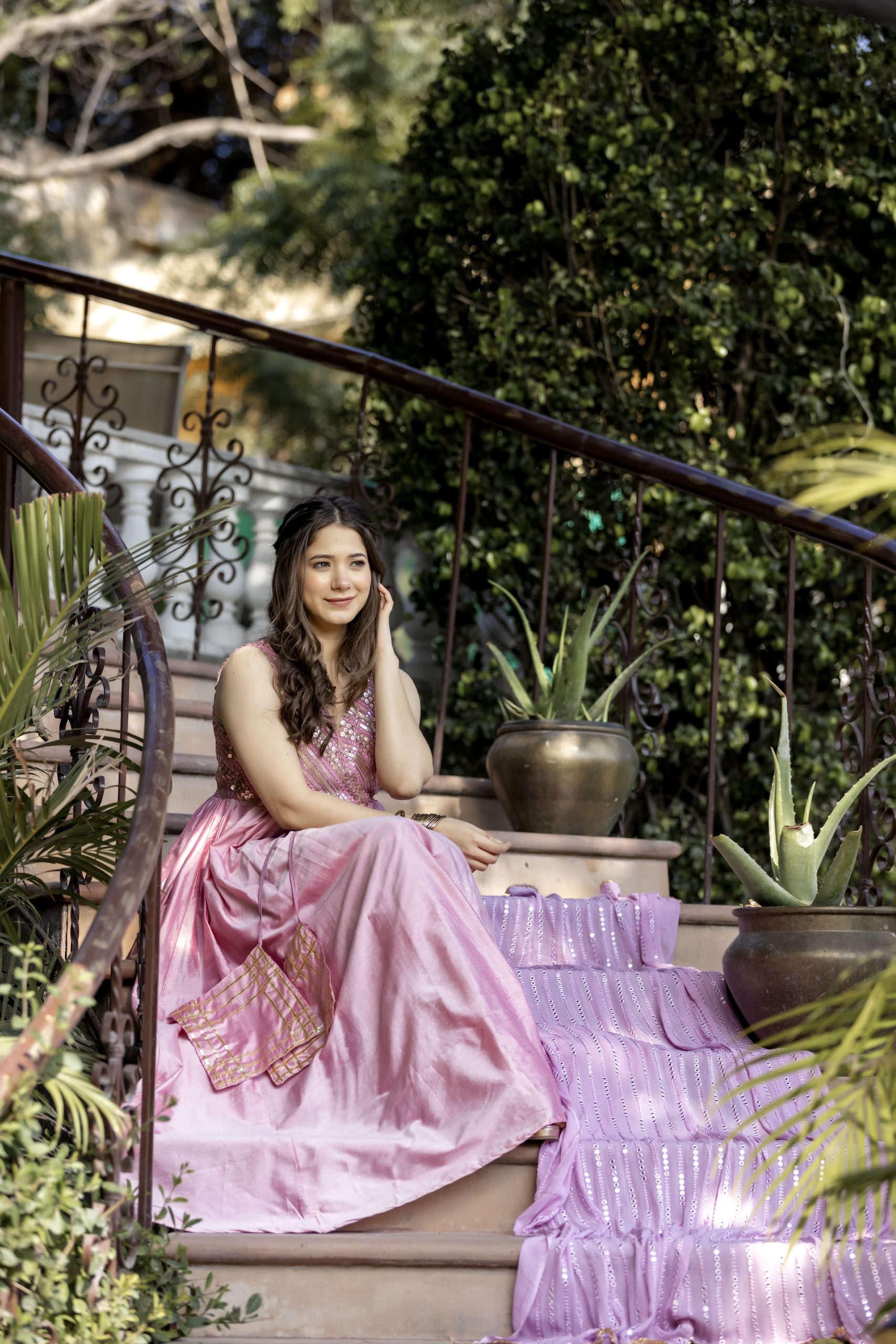 This outfit is paired with a delicately sequinned net dupatta in a pastel lilac hue — adding sparkle and grace to every step. Ideal for festive occasions, haldi-mehendi functions, or intimate weddings.